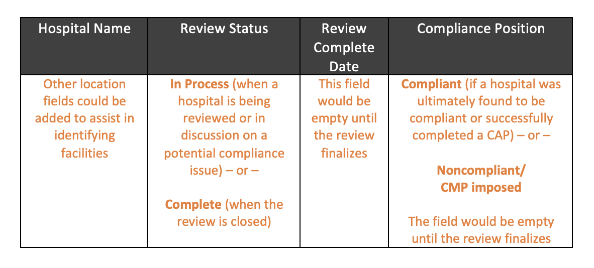 However, we do understand the need for CMS to address the concerns of the public that hospitals – potentially some that have been requested to be reviewed – are being evaluated. To address this need, we suggest that CMS could display the following language and table: