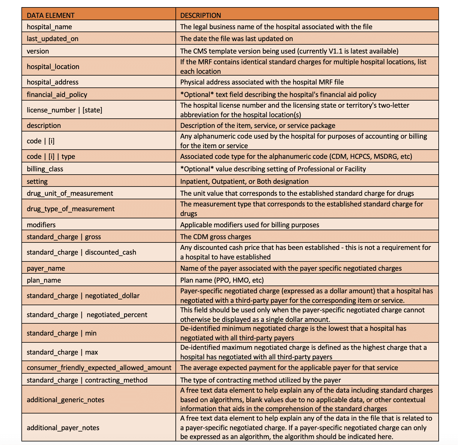 Previously, other digital formats – such as XML were permitted, but, the new CMS templates would only be permitted in the above formats. This likely won’t pose much of an issue to hospitals as these two formats are currently widely used for the MRF delivery.