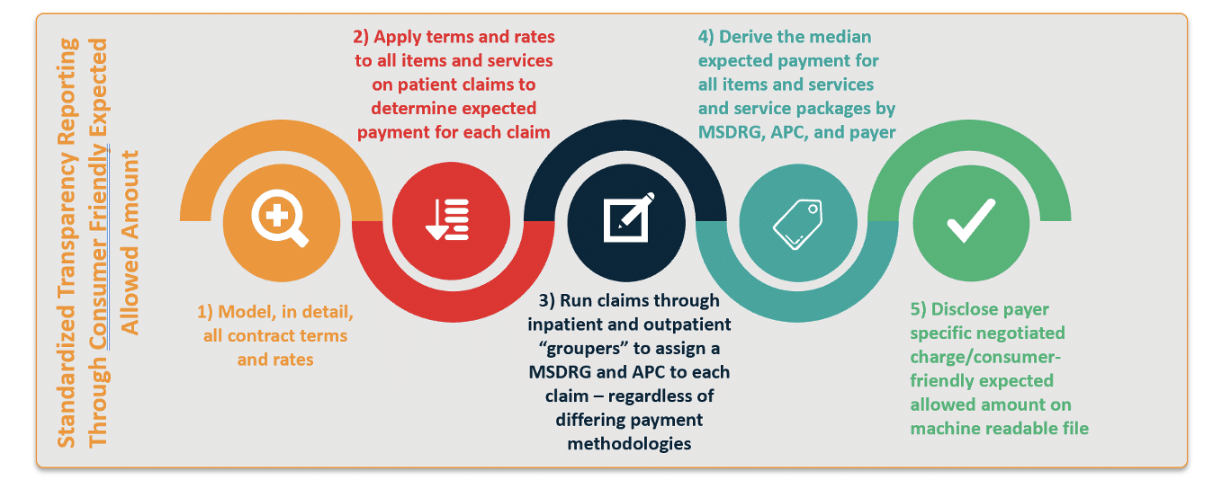 We also believe that future rule making should include language for payers to produce the Consumer Friendly Expected Allowed amount and to report in a consistent inpatient (MSDRG) or outpatient (primary APC) methodology. This would allow comparison across all hospitals and payers. Until this is achieved, there will always be questions regarding source data construction that will render disclosed data relatively meaningless. In the graphic below we illustrate the steps any hospital or payer could take to produce this field and report it in the same manner. Not only would this achieve comparability of results, it also could dramatically improve payer transparency file size.
