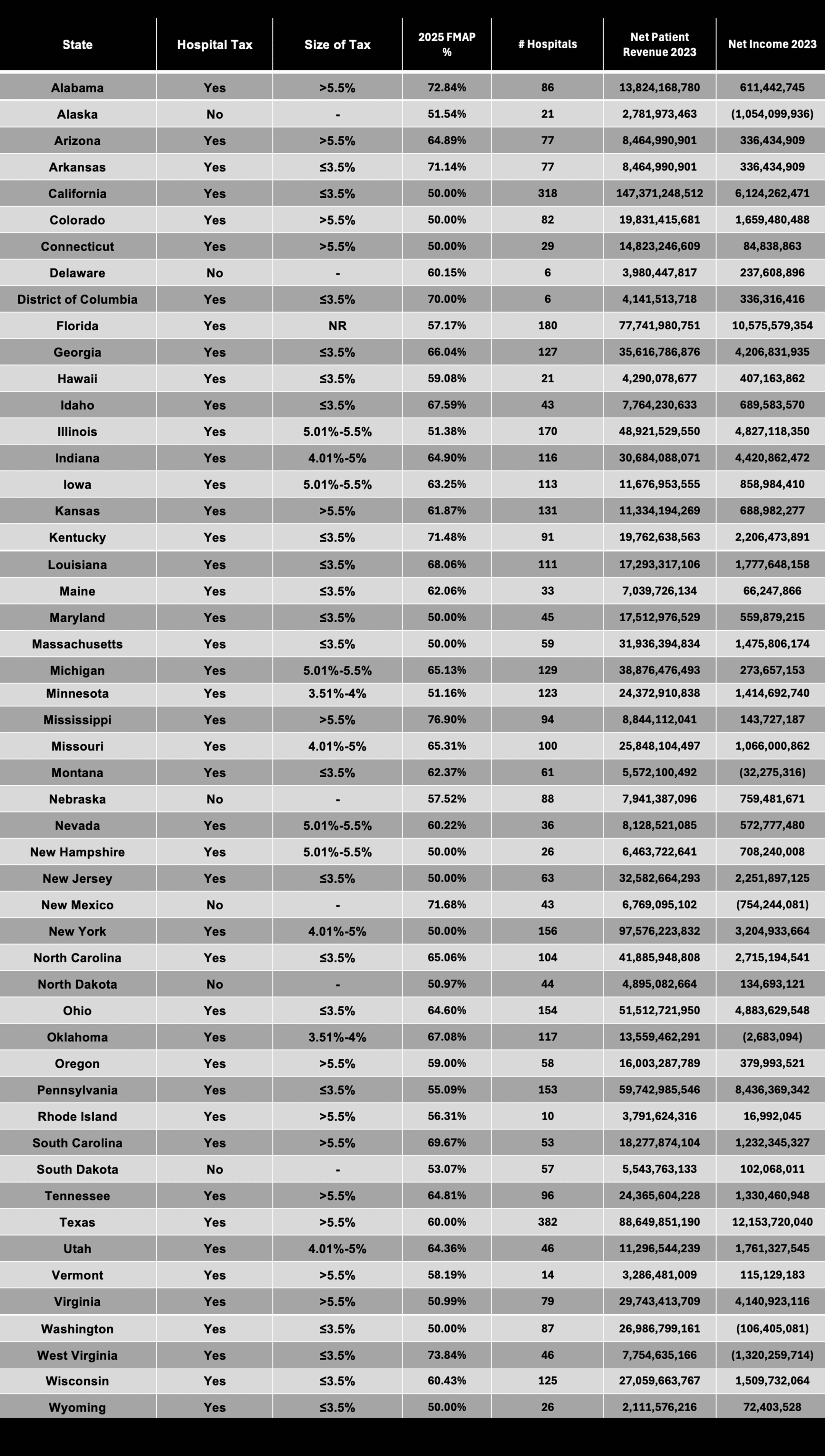 Let’s use Alabama as an example. Alabama’s hospital provider tax rate is 6.0% of net patient revenue, according to the Alabama Department of Revenue. The state’s current FMAP is 72.84%. In 2023 we found 86 Alabama hospitals with combined net patient revenue of $13,824,168,780. When the safe harbor rule is reduced to 3.5% Alabama would stand to lose $251,738,111. Note that this value is 41 percent of the total reported net income by hospitals in Alabama ($ 611,442,745).