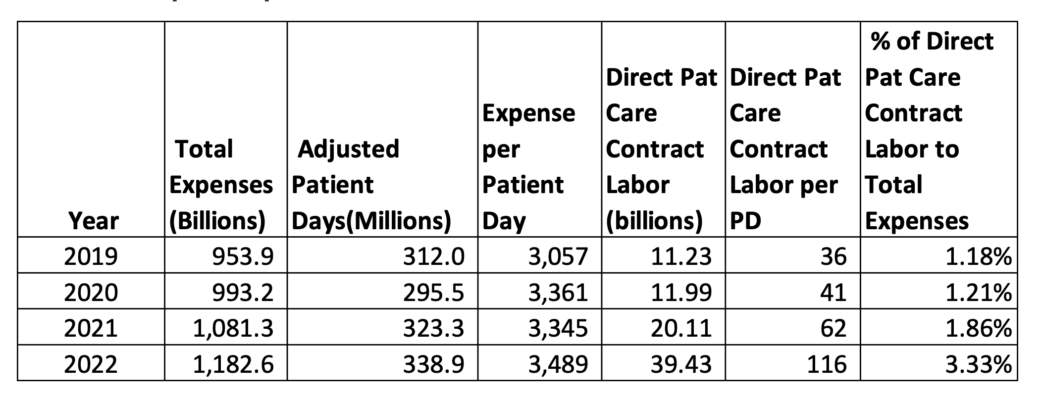 Using data from Worksheet S-3 in the Medicare Cost Report and shown in Table 1, we are able to identify contract labor costs associated with direct patient care. In 2019 the total reported value for contract labor associated with direct patient care was $11.23 billion and this value increased to $39.43 billion in 2022, a 251 percent increase. This value is almost identical to the value reported by AHA in their more limited data set. Direct Patient Care Contract Labor (DPCL) expenses accounted for 1.18% of total hospital expenses in 2019 and increased to 3.33% in 2022. The increase in expenses per patient increased by $432 ($3,489 less $3,057) and the increase in DPCL per patient day increased $80 ($116 less $36). While DPCL is a relatively small area of total expense, increases in DPCL accounted for 18.6% of the total increase in hospital expenses. This observation would indicate that DPCL has been a factor in rising hospital expenses.