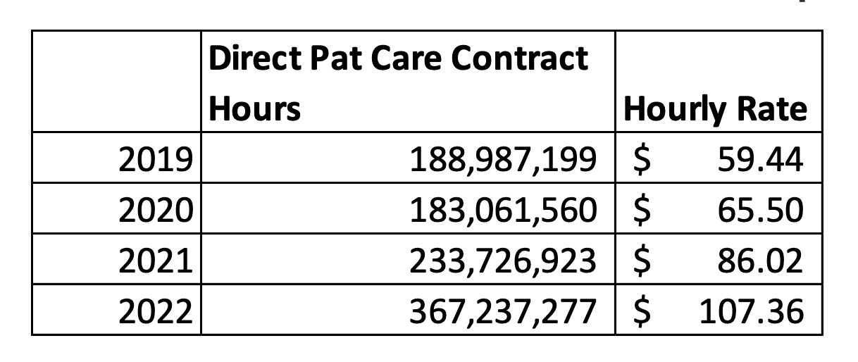 The AHA study also cited a 139% increase in DPCL hours combined with a 57% increase in wage rates. Data from Worksheet S-3 of Medicare Cost Reports shows 2019 DPCL hours were 188.987 million and 367.237 million in 2022 which is a 94% increase and is below the AHA value of 139% (Table 2). Average hourly salary from Worksheet S-3 shows a 2019 hourly wage rate of $59.44 which increased to $107.36 in 2022, an 81% increase which is above AHA’s value of 57%. While our data suggests a similar increase in total DPCL expenses, the data from our larger data set suggests a lower rate of increase in DPCL hours but a larger increase in the average hourly wage rates. This indicates that the employment of contract labor is becoming much more expensive as labor markets tighten.