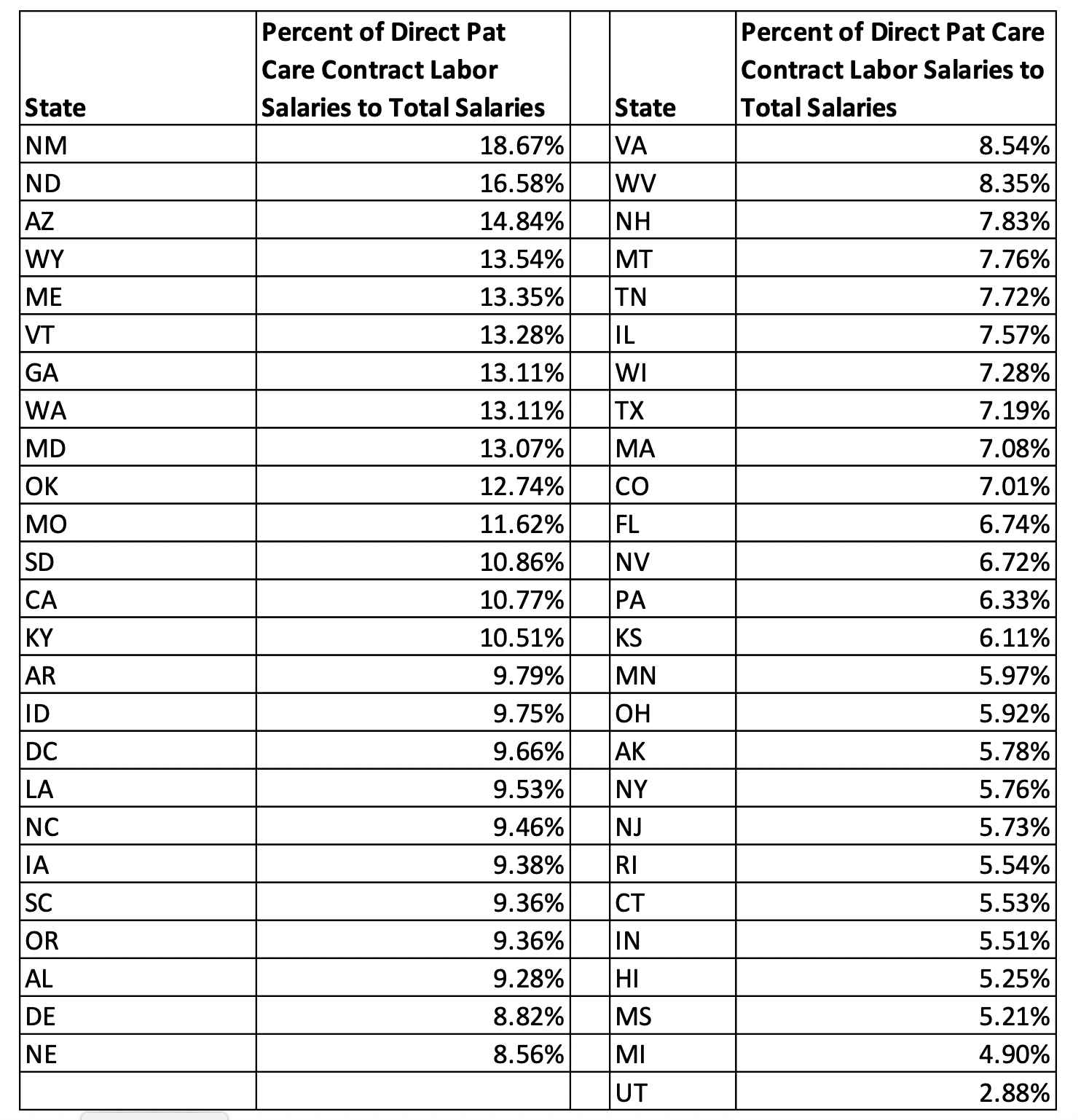 The next piece of the analysis was to determine if there were significant variations in the reliance on contract labor by region. We computed the reliance on contract labor as the percentage of DPCL salaries to total hospital salaries for 2022. The results are presented for each state in Table 4. There does not appear to be a discernable regional difference between states with high and low uses of contract labor. New Mexico had the largest use of contract labor while its neighboring state of Utah had the lowest rate.