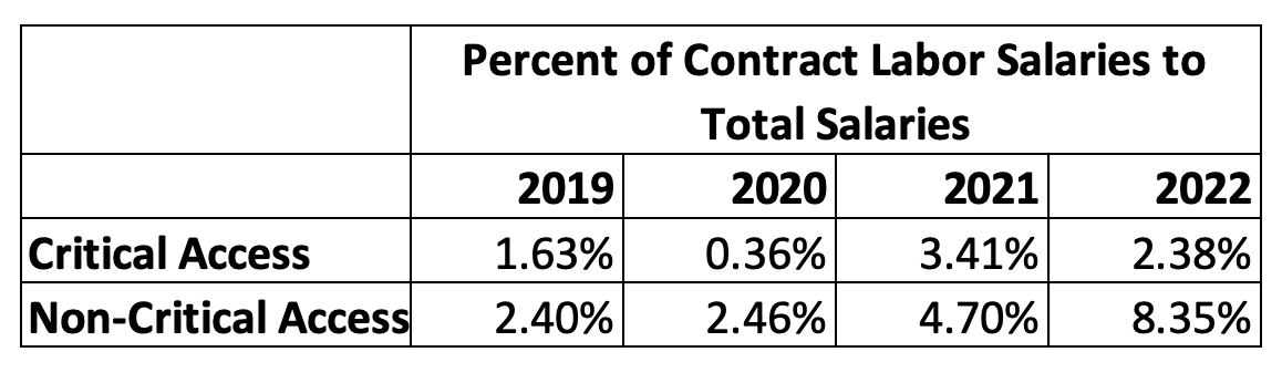 We did notice that hospitals designated as Critical Access used significantly less contract labor relative to non- critical access hospitals in all 4 years See Table 5. The percent of direct patient care contract labor to total salaries was 2.38% in 2022 for critical access hospitals compared to 8.35% for non- critical access hospitals.
